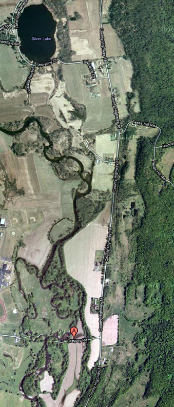 Satellite image, 2011. The Unadilla River meanders more than in 1903, and briefly forks near where the George Colburn farm once was. Bright areas have been recently plowed.