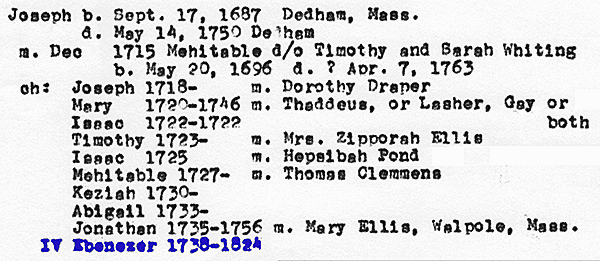 Captain Joseph and Mehitable had two sons they named Isaac; one died in infancy. (After losing a child, Puritans frequently reused the same name when another baby came along. One couple, after losing four children in an epidemic, managed to produce four more, and gave them all the same names.) Ref