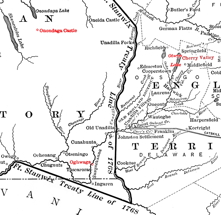 The Continental Army destroyed Onoquaga (on the map, Oghwaga) in fall 1778. Loyalists and Iroquois allies attacked Cherry Valley a month later.