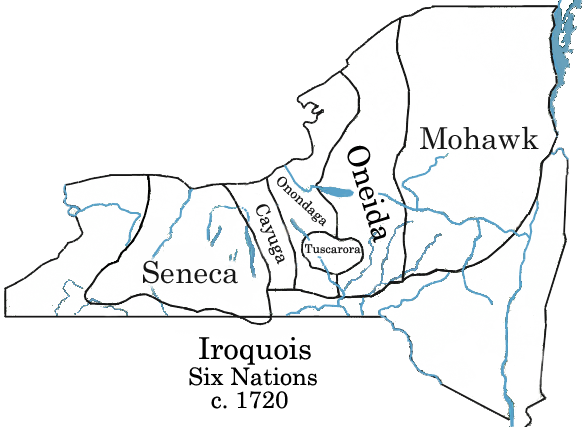 For centuries, most of what became upstate New York was the territory of five Native American tribes who spoke a common language, known to colonists as the Iroquois (they call themselves Haudenosaunee, “People of the Longhouse.”) Between 1000 and 1500 A.D. the Iroquois mostly lived in fortified villages. They abandoned this system in the 1600’s when European diseases that decimated Native populations across the continent struck hardest where people lived in concentrated villages. Ref