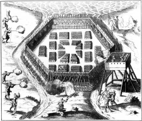 French explorer Samuel de Champlain's sketch of his unsuccessful assault on a stockaded Onondaga village in 1615. The walls surround a group of longhouses.