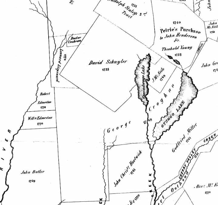 Sometimes patents were awarded after the Iroquois ceded title, and sometimes before. In 1768, representatives of the Iroquois and four British colonies met at Fort Stanwix, a British military base near the headwaters of the Mohawk (which later became the city of Rome, NY.) There they signed the first Treaty of Fort Stanwix, in which the Iroquois ceded title to all territory east of the Unadilla River (along the western edge of the map above.) The treaty supposedly also covered lands as far away as Kentucky that the Iroquois claimed through “right of conquest” of the Natives living there. The colonial authorities hoped that drawing clear boundaries would end frontier violence, while the Iroquois hoped it would limit British colonial expansion.