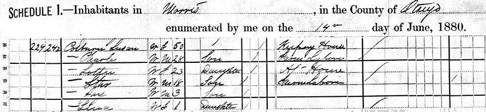 In the 1880 census, Elijah Colburn's recently widowed Susan is listed as head of household. Oldest son Charles and youngest son Starr are listed as "farm Laborers." The census erroneously reports Charles's wife Charlotte ("Lottie") and their children Jay and Lena as children of Susan.