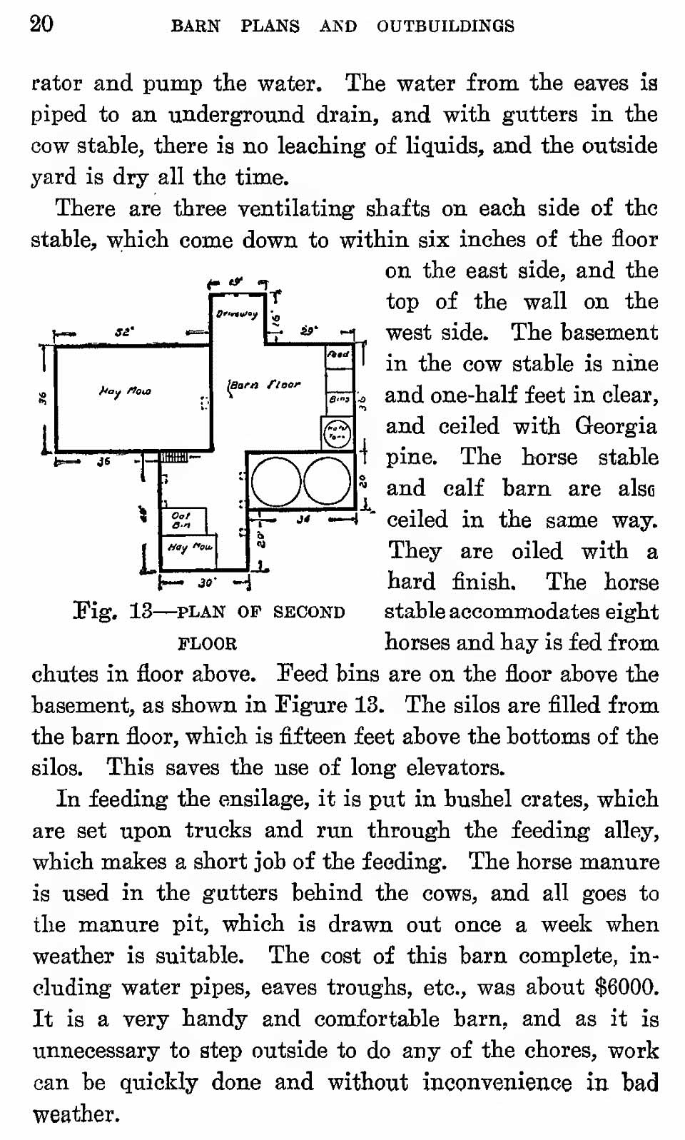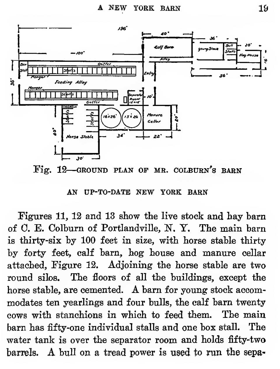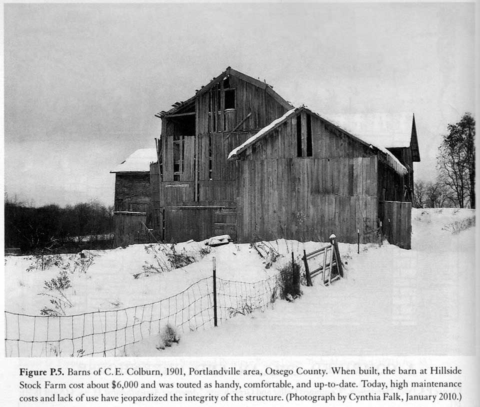 At the beginning of the twentieth century...new barns in New York had stone foundations, wood frames, and wood cladding. "An Up-to-Date New York Barn" singled out in a book of barn plans was praised for its cement floors, a recent innovation. The rest of the sizable building, owned by C.E. Colburn of Portlandville, was very traditional in its use of materials...The foundation was fieldstone, and the principal components of the frame were heavy timbers, which were held together with mortise and tenon joints. The exterior was clad in vertical wooden boards, and the gambled roof was finished with wood shingles. The two round silos were constructed from wooden staves held in place with iron bands. Coburn's Hillside Stock Farm was "up-to-date" in terms of its facilities for efficient feeding, breeding and processing, but its concrete floor with mangers and manure gutters was the owner's primary foray into modern materials. Ref