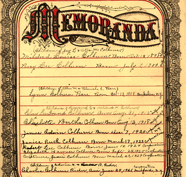 A Memoranda page in the Colburn family bible, used to record births of Charles and Charlotte's grandchildren