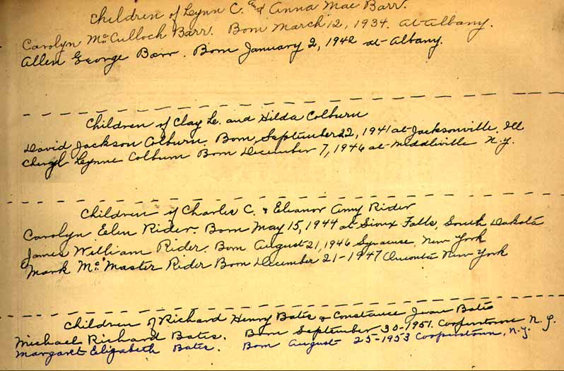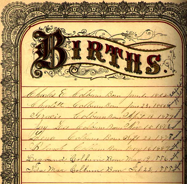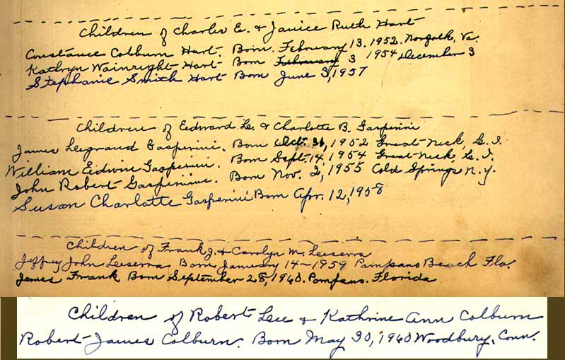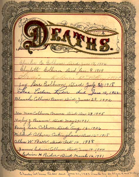 The names, birthdates and place of birth of Charles and Charlotte's grandchildren and great-grandchildren appear below, as entered in the family Bible by Lena Colburn Rider.