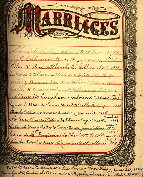 Births of great-grandchildren were recorded on blank pages of the Colburn Bible.