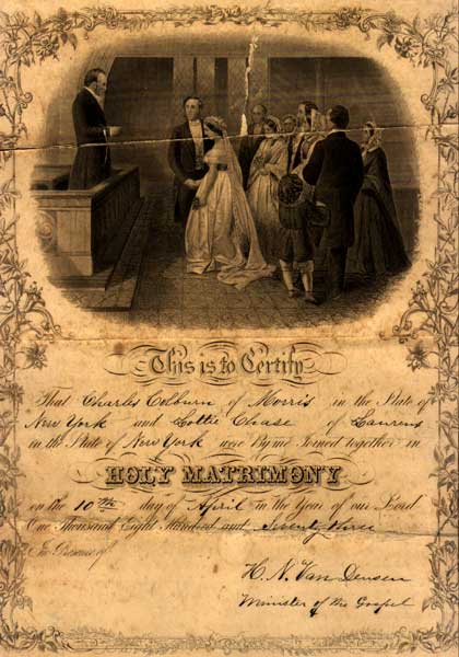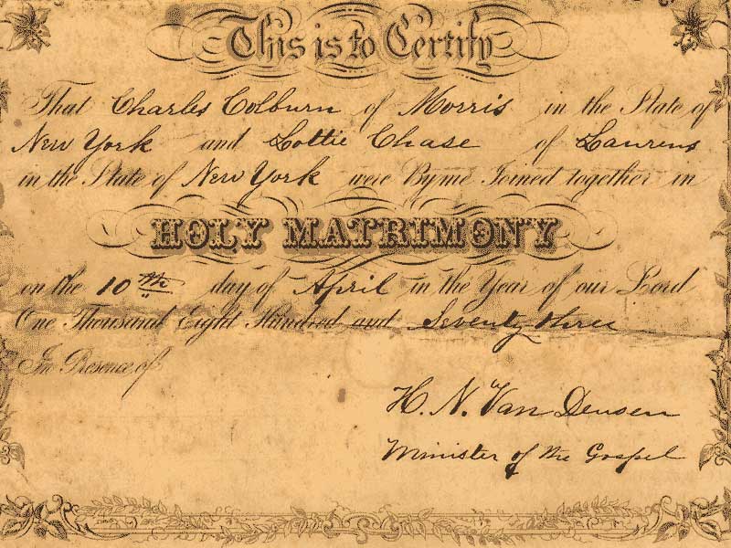 Wedding certificate of Charles Colburn of Morris and Lottie Chase of Laurens, 10th day of April 1875.