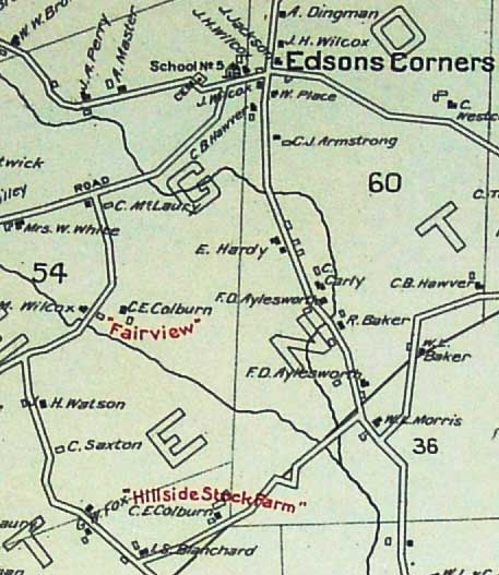 One possible explanation for this discrepancy can be found in the 1903 atlas cited earlier. The name C.E. Colburn appears twice on the Milford page: by the red label “Hillside Stock Farm,” and further to the north, by another named farm, “Fairview.” The house and barn labeled “Fairview” no longer exist; only cornfields appeared at that location in 2014. Perhaps Hillside Stock Farm extended all the way across the creek to “Fairview,” and Charles had buildings at both ends. The larger farmhouse might have once been at the northern, “Fairview” end, which is much nearer to Edson’s Corners. The smaller house near the big barn at the southern end might have housed workers or other family members.