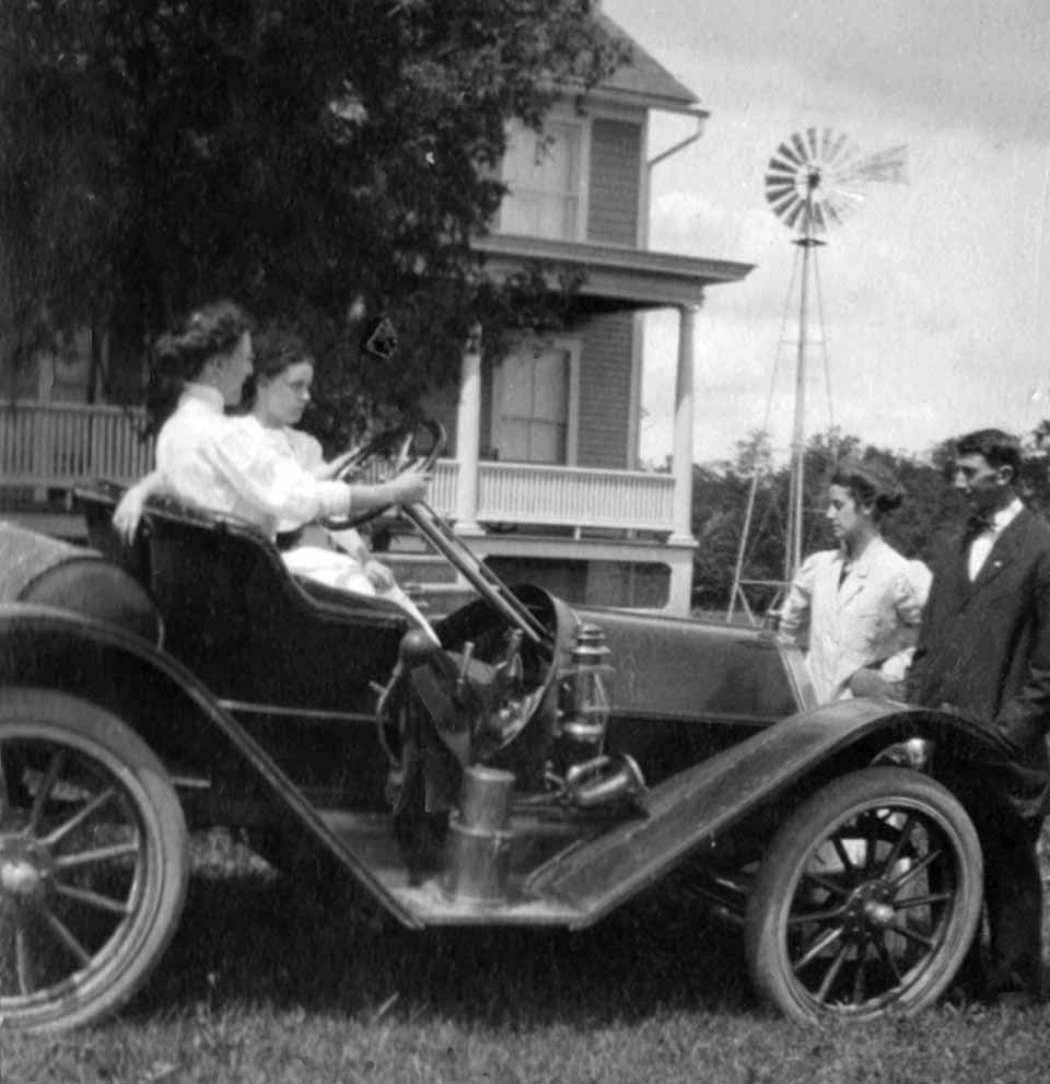 May Colburn, Christine Briggs, Mildred Smith Colburn, Legrand Colburn with Legrand’s car (probably a 1914 Metz Runabout) in front of a Charles Colburn farmhouse