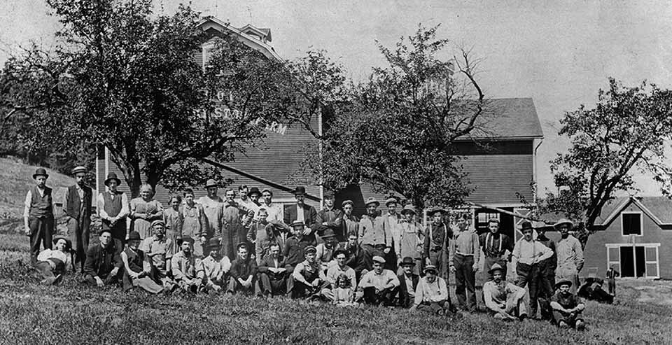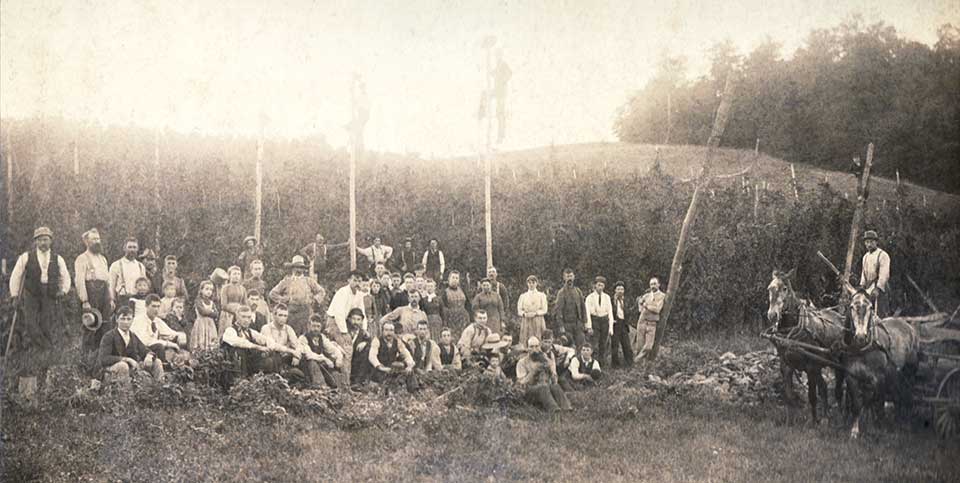 Hop pickers, posed before the main barns of Hillside Stock Farm, built in 1901.