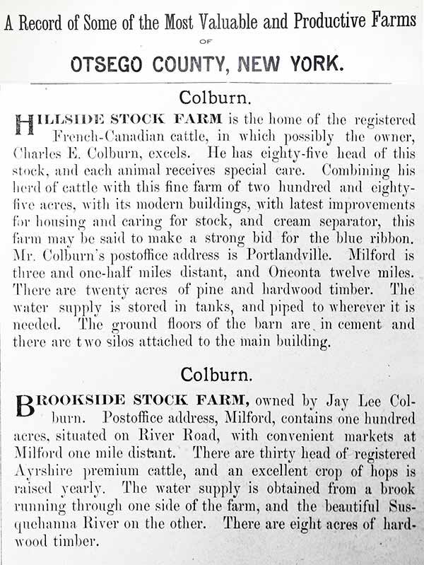 Three generations of Colburn had farmed in the valley of the Unadilla River. Charles moved his family over the hills east to the valley of the Susquehanna, which was both larger and commercially more central, at least after 1869 when a railroad began running along the river. Charles maintained large houses both in the railroad depot town Milford and at his Hillside Stock Farm, within Milford township above the southern hamlet of Portlandville.