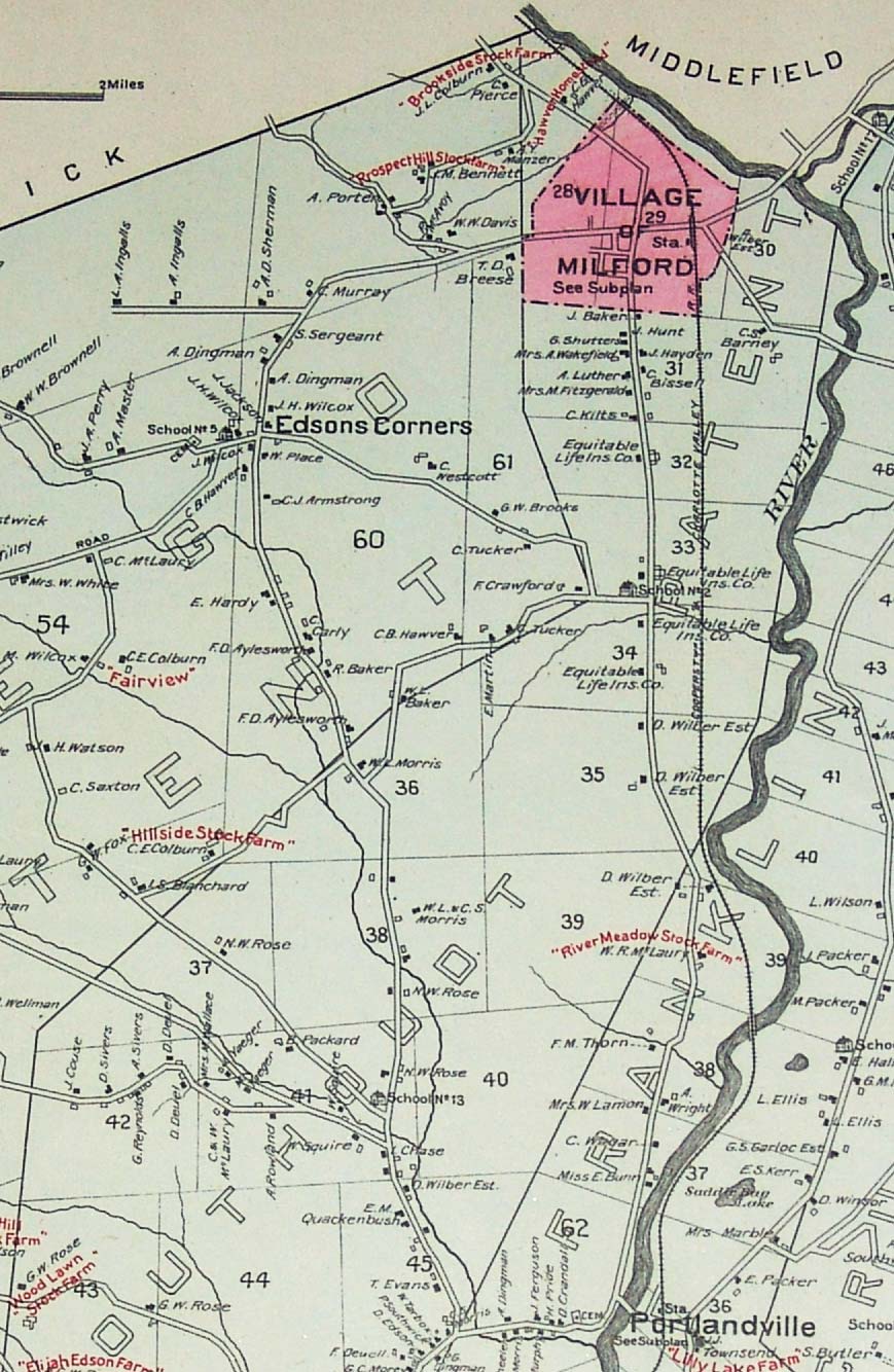 Detail of the 1903 atlas page for the town of Milford. Two farms named in red appear mid-left next to the name C. E. Colburn. The hamlet of Portlandville is lower right. Charles' eldest son Jay owns the "Brookside Stock Farm," above the Village of Milford.