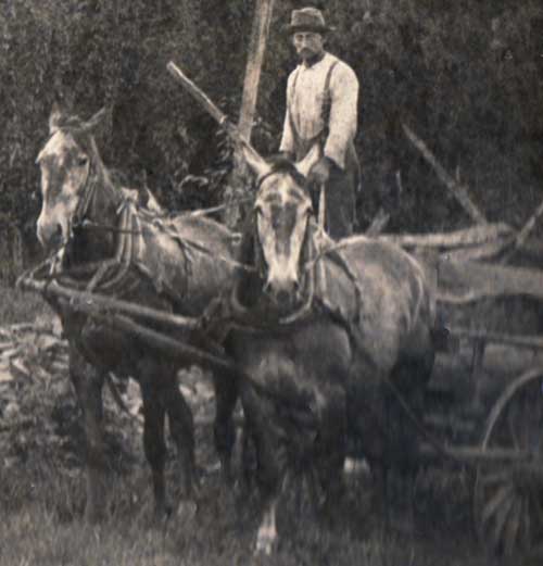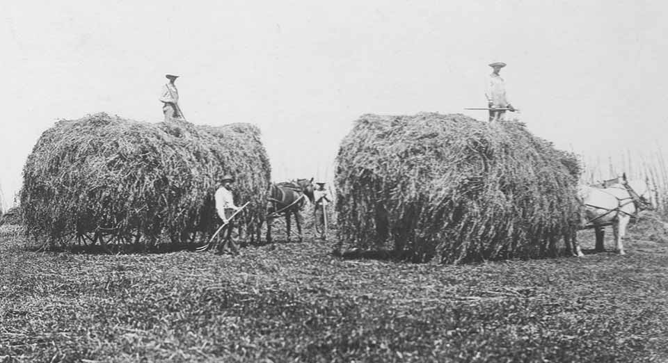 Bringing in the hay: Charles atop the wagon left, his son Legrand on the wagon right.