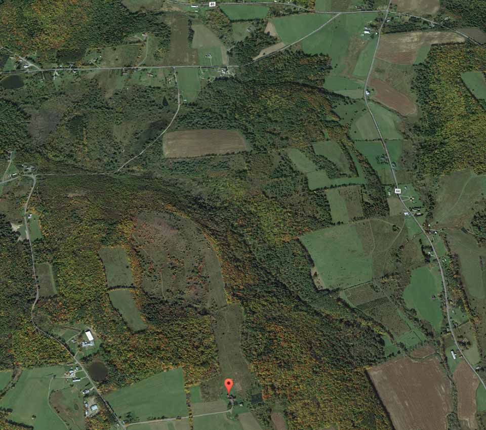 2014 satellite view of the southern part of the map shown above from the 1903 atlas. Though most roads from 1903 still exist, Loucks Road, near the bottom, now dead ends at what once was the Hillside Stock Farm (red marker.) In 1903, the road went on to intersect what is now County Highway 44.