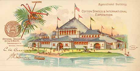 Postcard from the Cotton States and International Exposition of 1895, showing the Agricultural Building. Cattle judged here could win gold, silver, or bronze medals.