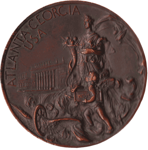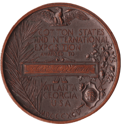 The reverse has a palm leaf, the American eagle, a cotton plant and the legend ‘COTTON STATES AND INTERNATIONAL EXPOSITION AWARDED TO [C.E. Colburn] ATLANTA GEORGIA USA MDCCCXCV’. The medals were executed upon a design prepared under the supervision of Mr. Horace Bradley, Chief of the Department of Fine Arts, and were delivered in the Summer of 1896, while the World’s Columbian medals, awarded two years earlier, were being delivered. Ref