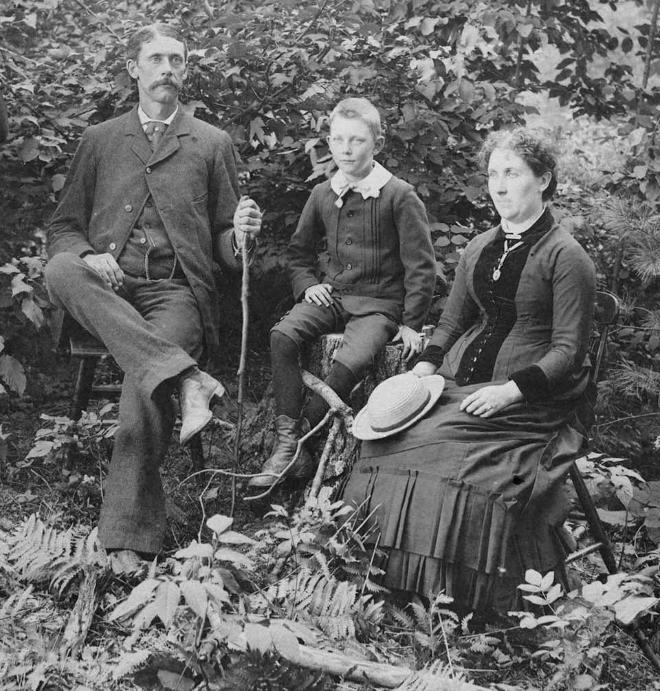 Charles and Charlotte Colburn family, circa 1883. Charles holds the reins of team of white horses hitched to a cart.