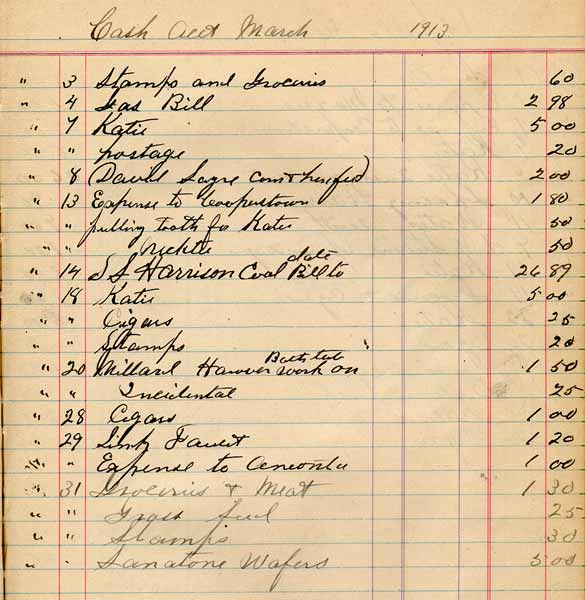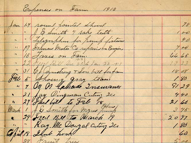 A sense of his daily life can be traced in the full 1913 ledger. Charles buys cigars, goes to church suppers and county fairs, throws holiday parties, pays farm workers, reads newspapers, pays taxes, and takes trips to nearby towns.