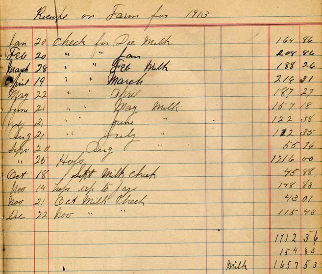Charles' ledger for 1913 has survived. By that year he seems to have shifted the focus of his farm from stock breeding to dairying. Improvements in transportation, refrigeration and pasteurization, along with population growth in New York City, made dairy farming a more profitable business in central New York. Receipts divide almost evenly between the sale of hops and of milk. No expenses or receipts appear to be associated with cattle breeding or trading.