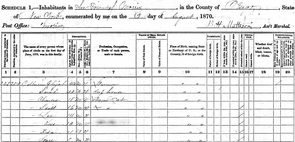 By the time of the 1870 census, Elijah had become a farmer. Unlike other farmers in these records, no estimate of the value of his real estate appears. This likely meant he was renting his farm, although a substantial farmhouse he occupied remained the home of one son, then another, many years after his death. In the Occupation column the woman listed as "keep house" is named Sarah, not Susan. Likely an error, or she may have used both names.