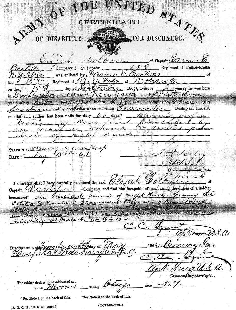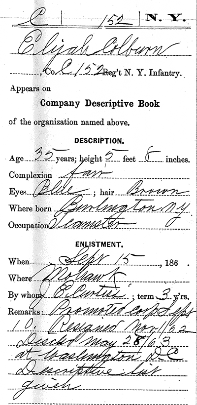 In 1863, Elijah spent less than a year in the 152nd Infantry Regiment of the Union army, company C (“recruited principally from Mohawk and Morris.”) According to a detailed 1912 military history: