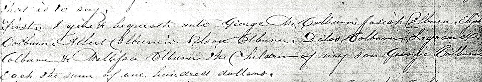 Excerpt from a copy of Ellis Colburn's will, in which he left $100 (about $2800 in 2014 dollars) to each of his son George's children but nothing to George himself.