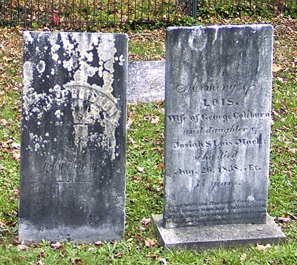 A sad indication of how George was thought of at the end of his life can be observed in the condition of his tombstone. His marker has weathered the years poorly compared to that of his first wife Lois, on the right, who predeceased him by thirty years. It must have been made of cheaper stone. Hers has a small base; his has none. Both are quite simple and deeply weathered compared to the handsomely carved, sturdy stones marking the graves of his parents and sisters in the same plot in the Burlington Flats cemetery.