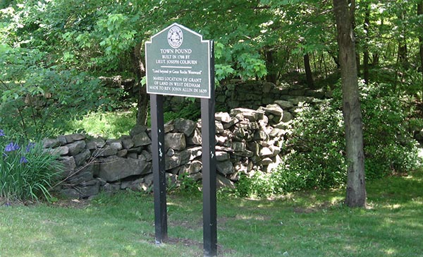Lt. Joseph Colburn is agreed to provide timber and to make and set up a good sufficient pound for the use of the Town and is to Receive for his labor and Charge therein forty shillings out of the Town rate.Towns built pounds to keep stray animals away from crops. Originally built of wood, Dedham’s was remade later with stone walls.