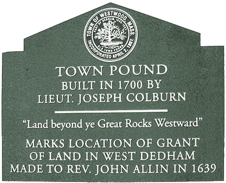 The pound appears on the Town Seal of Westwood, designed by a Colburn descendant, Lucius Damrell. The seal also features the Avery Oak, over 600 years old when it blew down in a hurricane in 1938. The last of the many towns carved out of the original Dedham grant, the district known as West Dedham became Westwood in 1897.