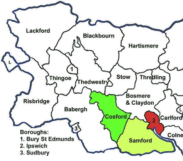 Western Suffolk Hundreds in 1830. Colborns lived first in Cosford then Samford.