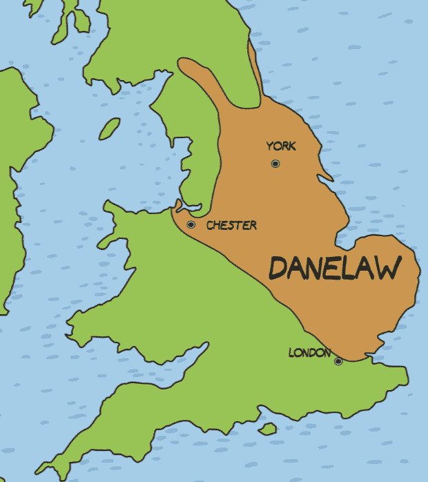 Map of England showing the extent of the Danelaw, circa 900 C.E.