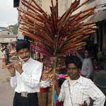 trident and hand drum. This one sat endlessly twitching his drum beside a staircase between the Gujeshwari temple and the main Pashupatinath complex, accepting donations from and giving his blessing to passing pilgrims, like this boy. |
